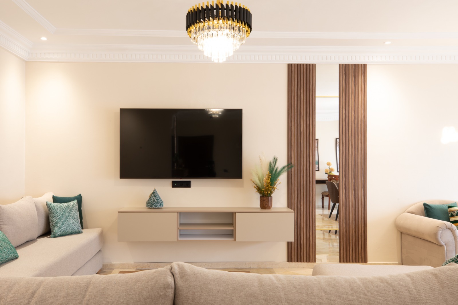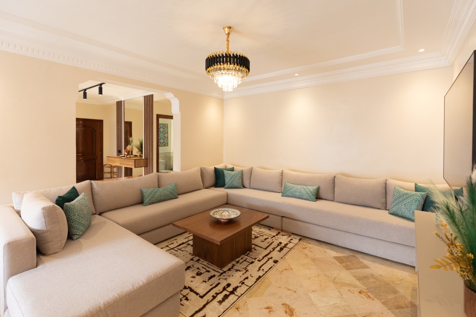 - Salon élégant avec des canapés confortables et un petit salon pour des moments de détente.